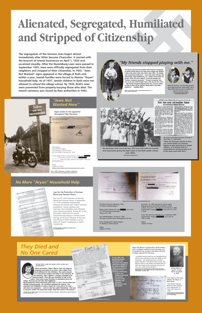 This powerful exhibit tells the true story of the Jewish families of Roth – neighbors, friends, and business owners – whose ordinary lives were gradually dismantled under Nazi rule.  What happened to the Jews of Roth occurred in much the same way throughout Nazi-occupied Europe. The exhibit places their story within the overall context of the events of the Holocaust.